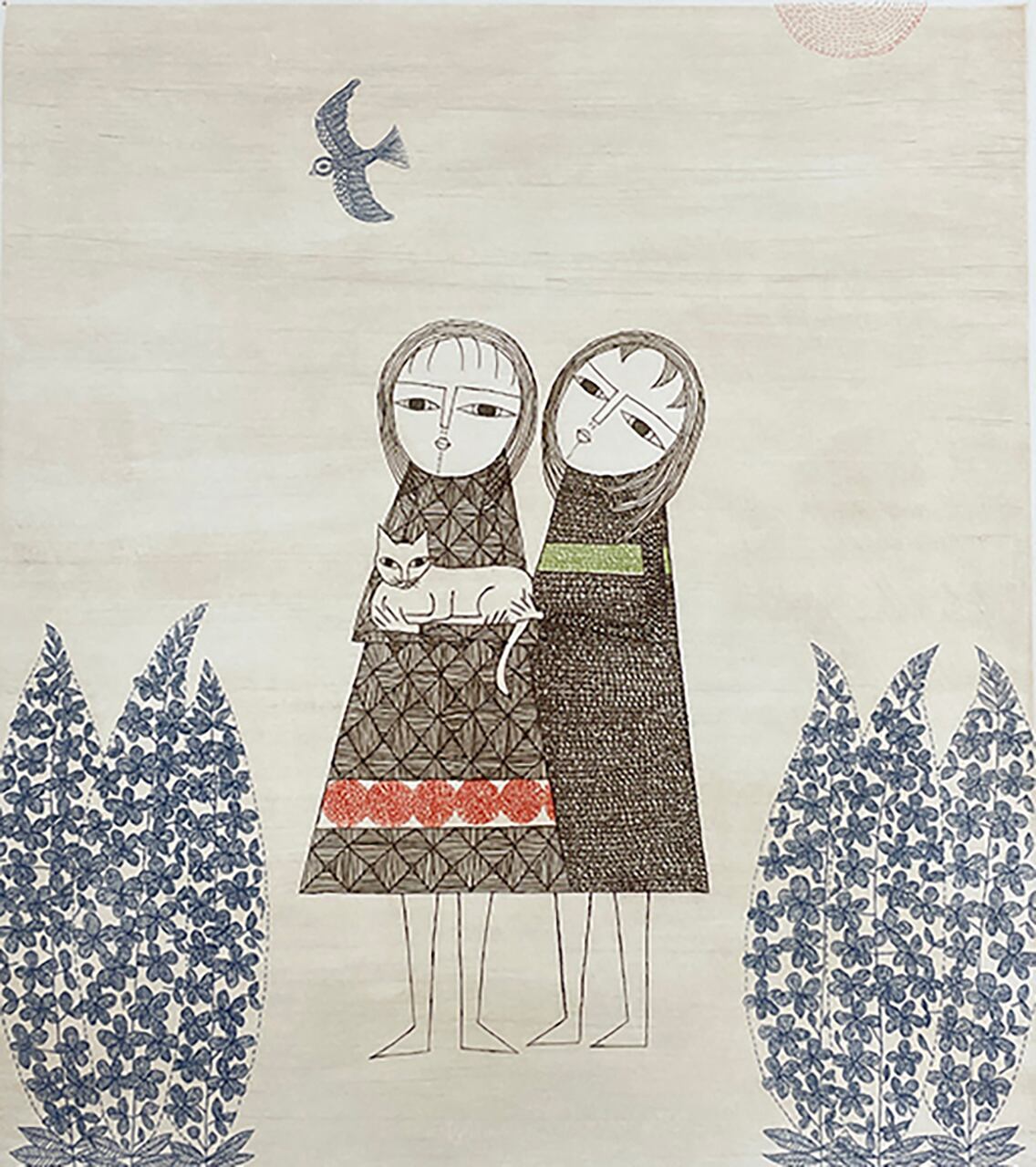 寄りそうふたりの少女と抱かれた猫、その穏やかな表情には、さりげない優しさとぬくもりが感じられます。